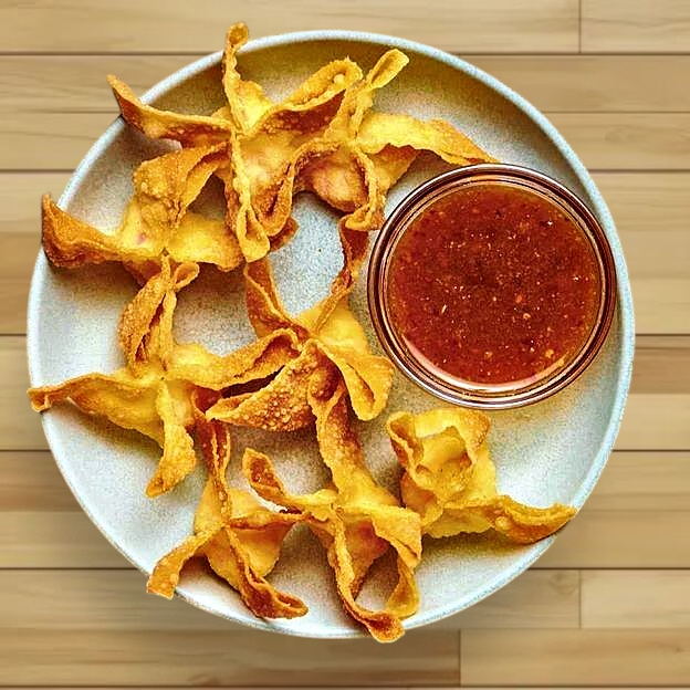 Crispy wontons filled with crab and cream cheese, served with a sweet chili sauce.