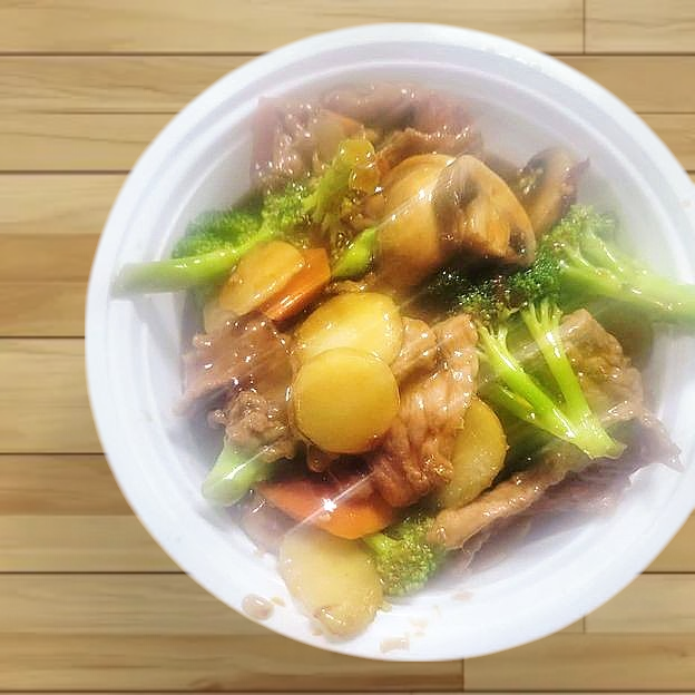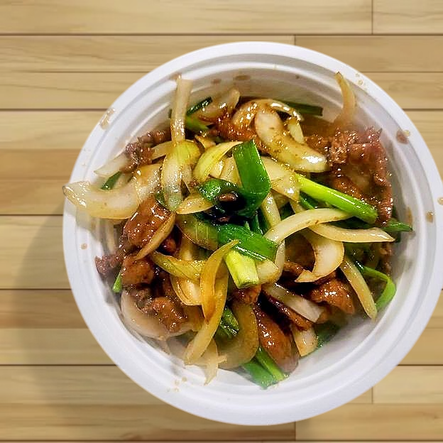 Tender beef strips stir-fried with vegetables in a sweet and spicy sauce.