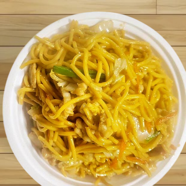 Stir-fried noodles with chicken, vegetables, and a light sauce.